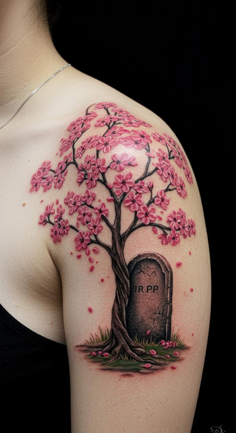 This tattoo serves as a profound tribute to lost loved ones, with the cherry blossoms symbolizing the transient beauty of life and the gravestone representing lasting memories.