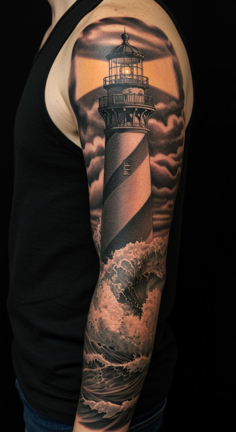 Lighthouse and Stormy Sea Full Sleeve Tattoo