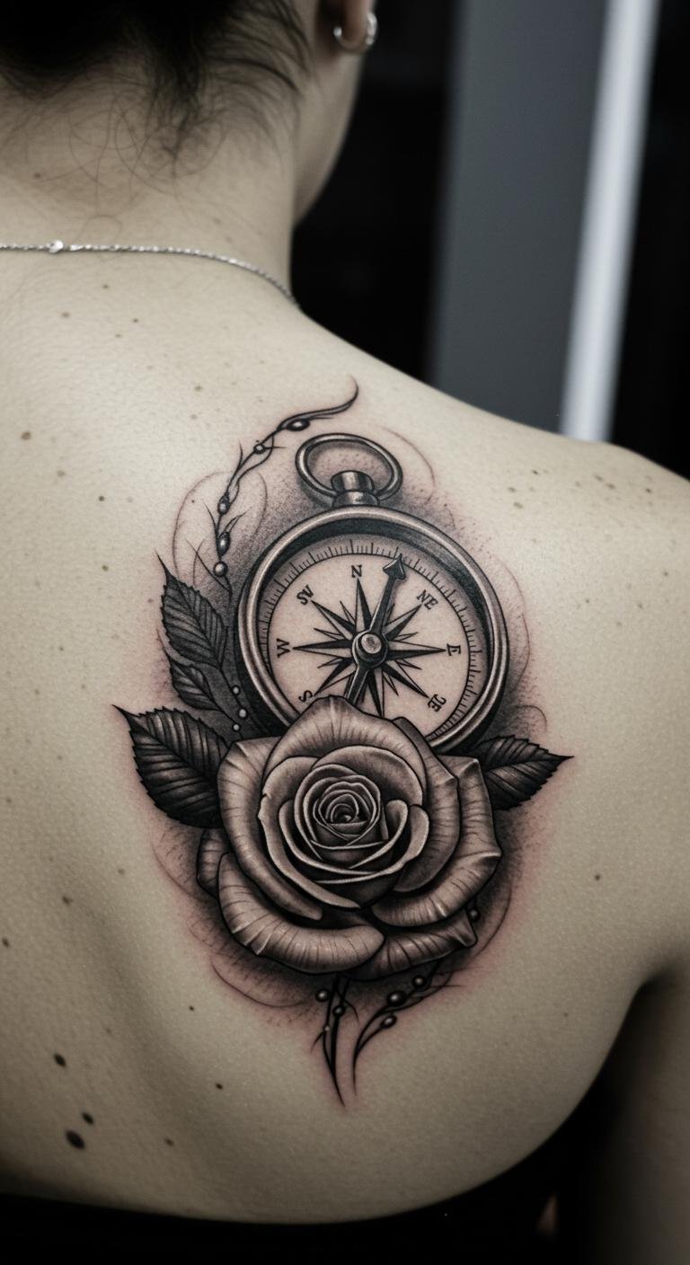 Ornate Compass and Rose Back Tattoo
