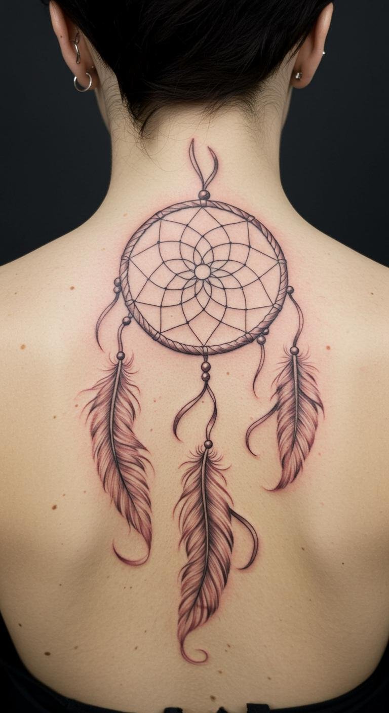 This breathtaking tattoo on the upper back embodies the essence of protection and remembrance. The dreamcatcher symbolizes the capturing of dreams and memories, while the feathers represent freedom and spiritual connection.