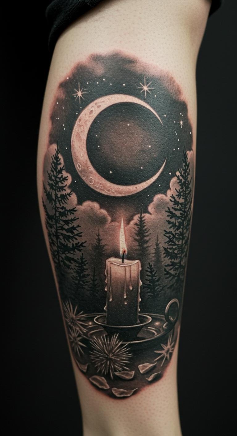 Moon, Candle, and Forest Calf Tattoo