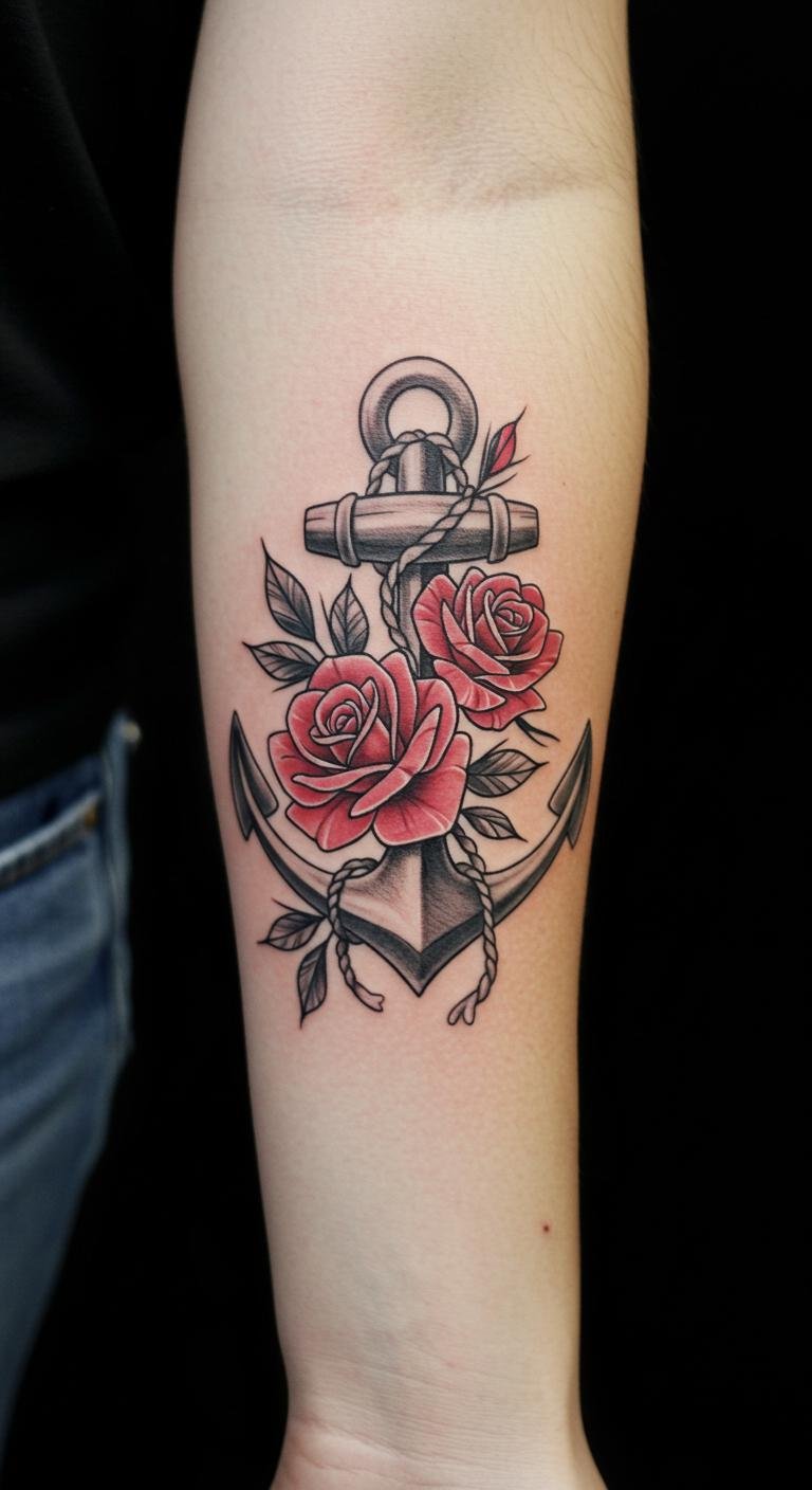 Anchor and Roses Forearm Tattoo