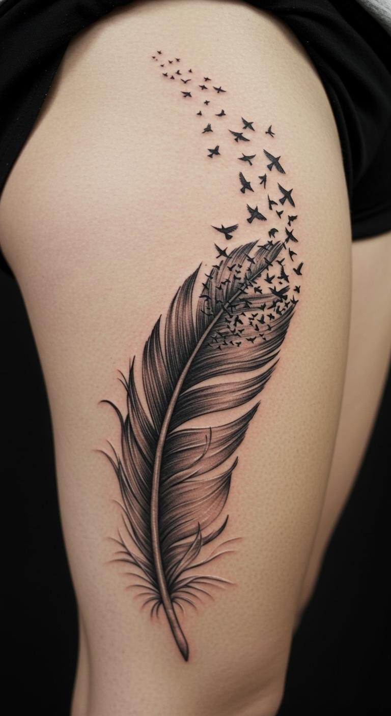 Feather Transforming Into Birds Thigh Tattoo