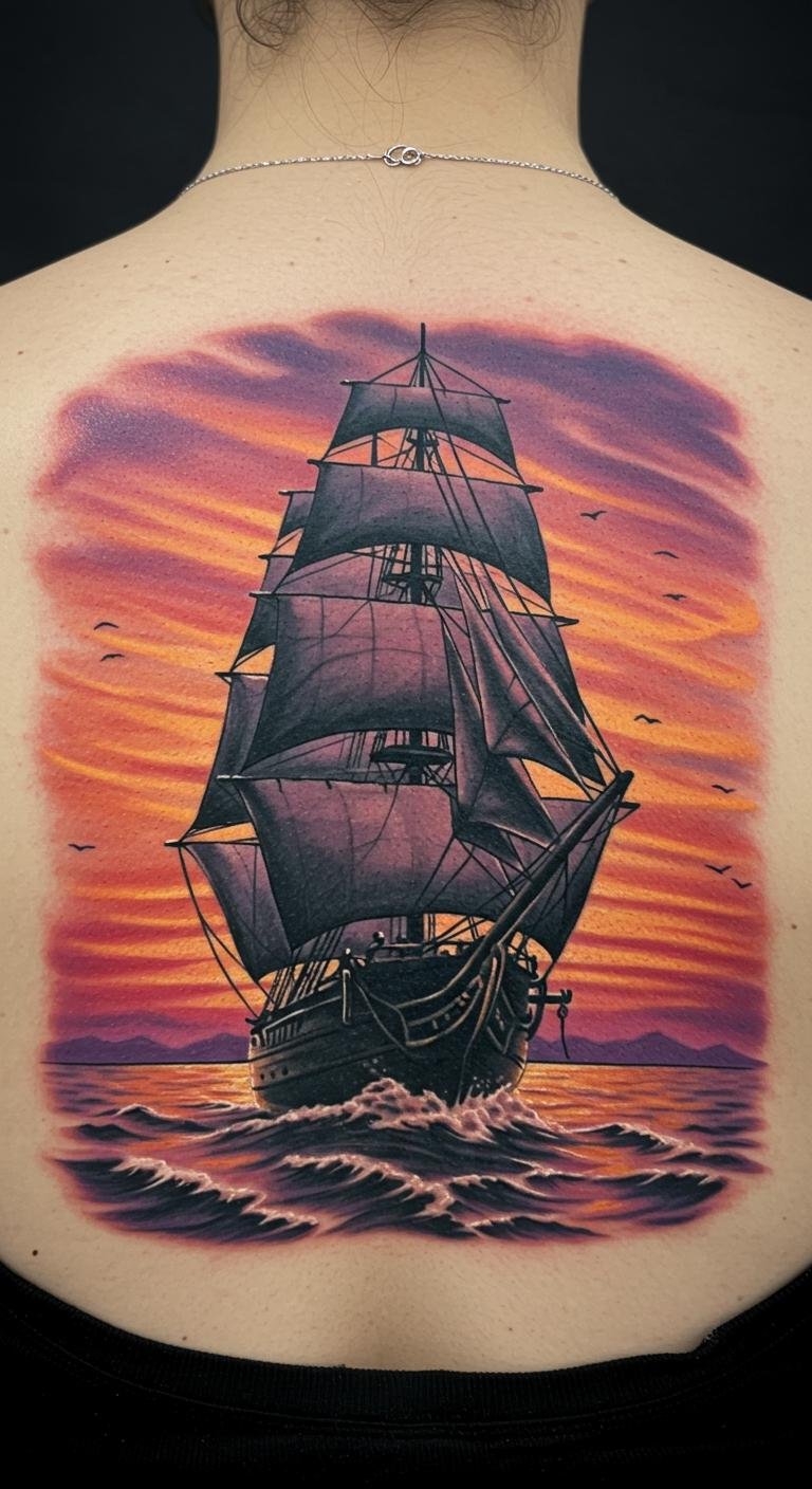 This tattoo symbolizes the journey of life, evoking feelings of adventure and nostalgia. The sailing ship represents exploration and the freedom of the open sea, while the sunset reflects the beauty of cherished memories and the passage of time.