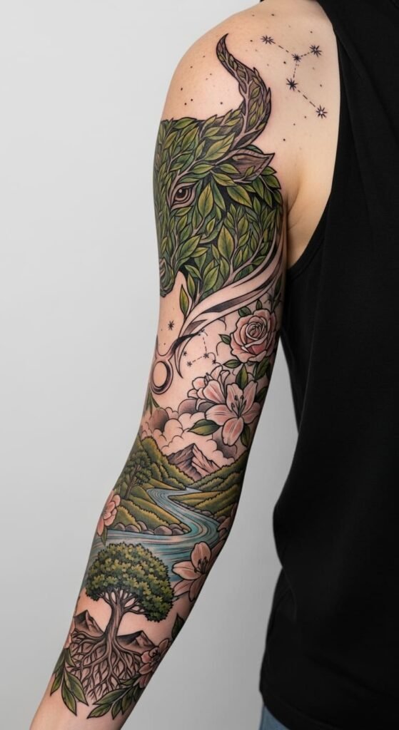 Trees and mountains evoke stability and resilience, reflecting the Taurus personality’s grounded nature. Positioned on the forearm, this tattoo isn’t only a personal emblem but also an expressive piece of art that invites admiration and conversation, allowing the wearer to embrace their individuality boldly.