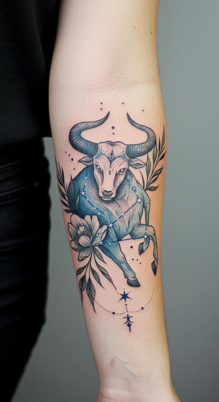 This Taurus constellation tattoo symbolizes strength, stability, and a deep connection to the cosmos, reflecting the wearer’s resilient spirit.