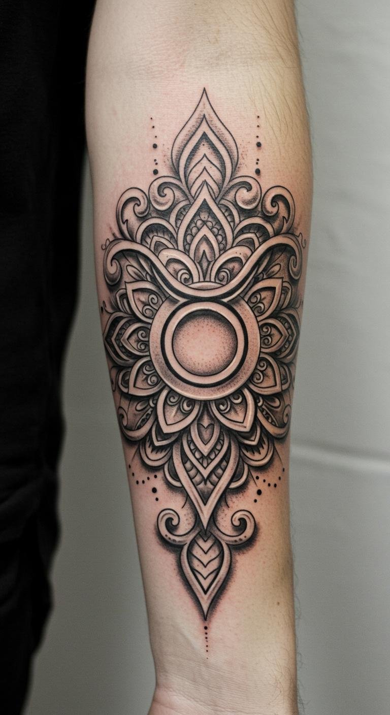 The Mandala Taurus tattoo on the forearm represents a personal journey towards spiritual balance and inner peace.