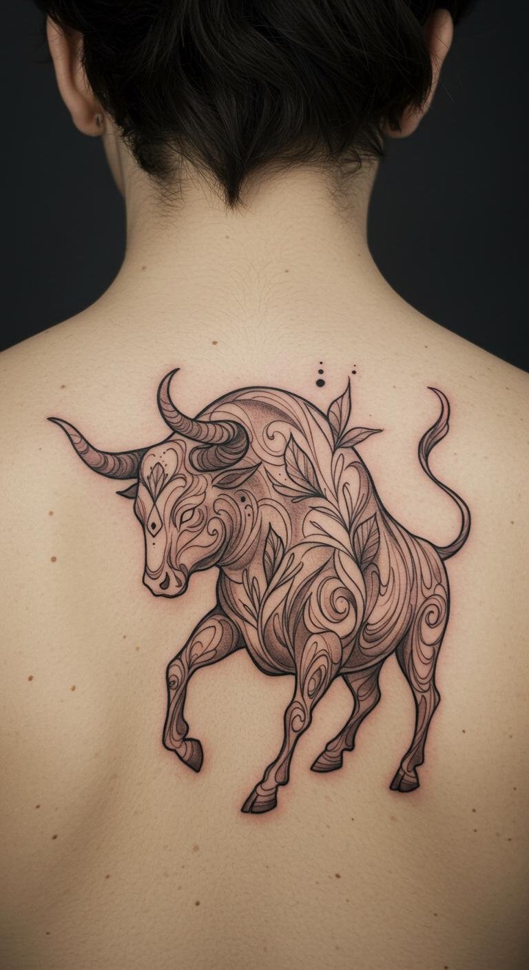 Positioned on the upper back, it allows the wearer to express their individuality confidently, visible yet personal. This placement is ideal for showcasing a connection to both nature and personal freedom, embodying the essence of a Taurus in a unique and artistic way.