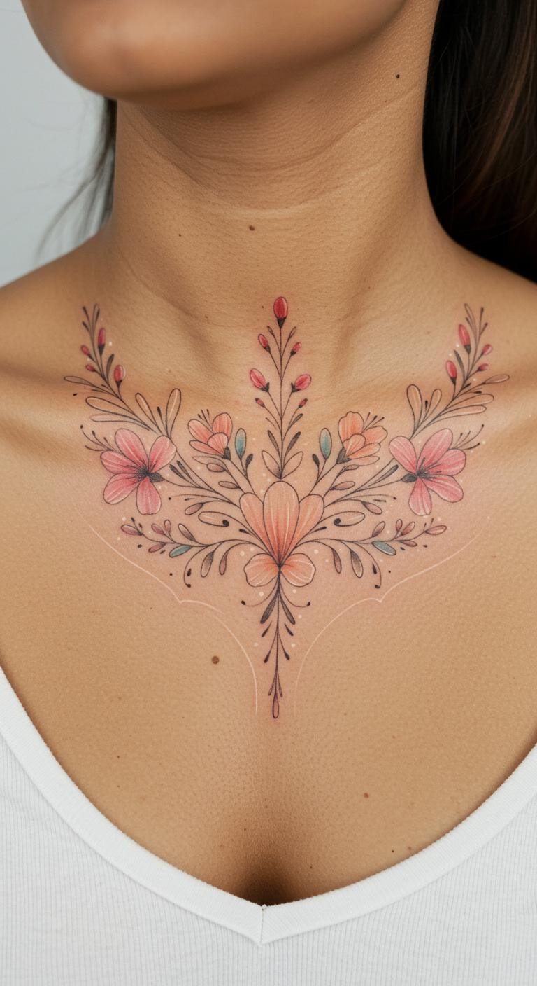 This enchanting tattoo beautifully embodies femininity and a connection to nature. The collarbone placement not only highlights the elegance of the neckline but also serves as a reminder of personal growth and transformation.