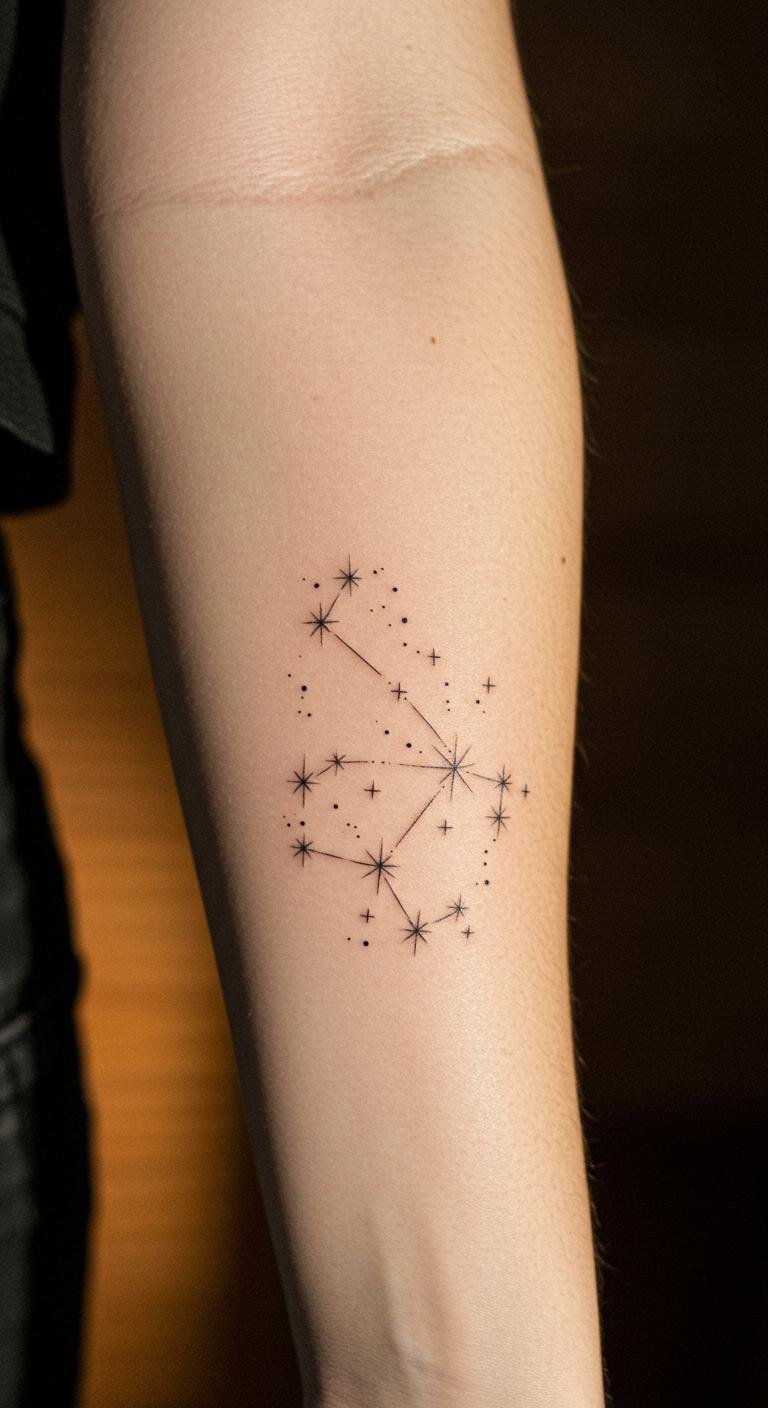 The Virgo constellation tattoo symbolizes purity, diligence, and analytical thinking, aligning perfectly with the traits of the Virgo zodiac sign.