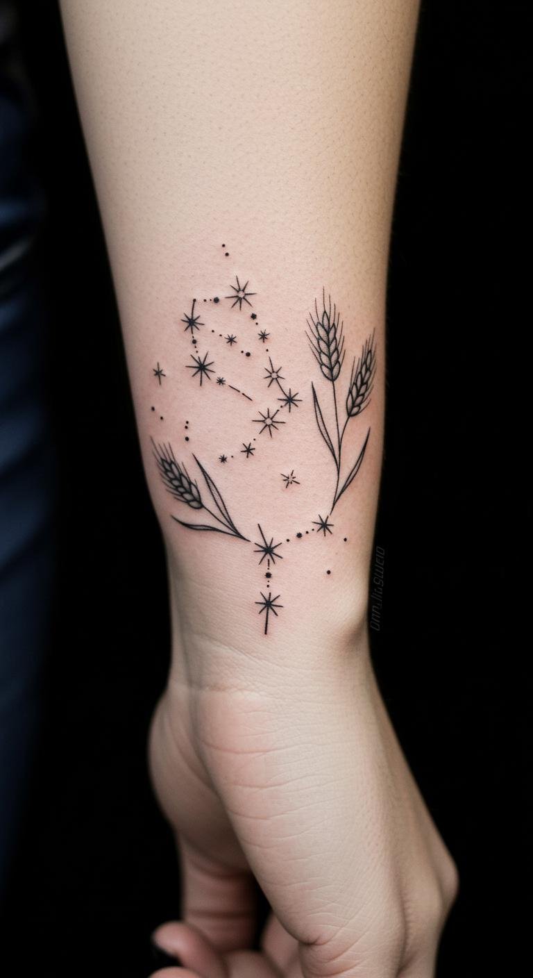 The Virgo tattoo on the wrist serves as a daily reminder of the wearer’s connection to their astrological identity, symbolizing traits such as practicality, wisdom, and attention to detail.