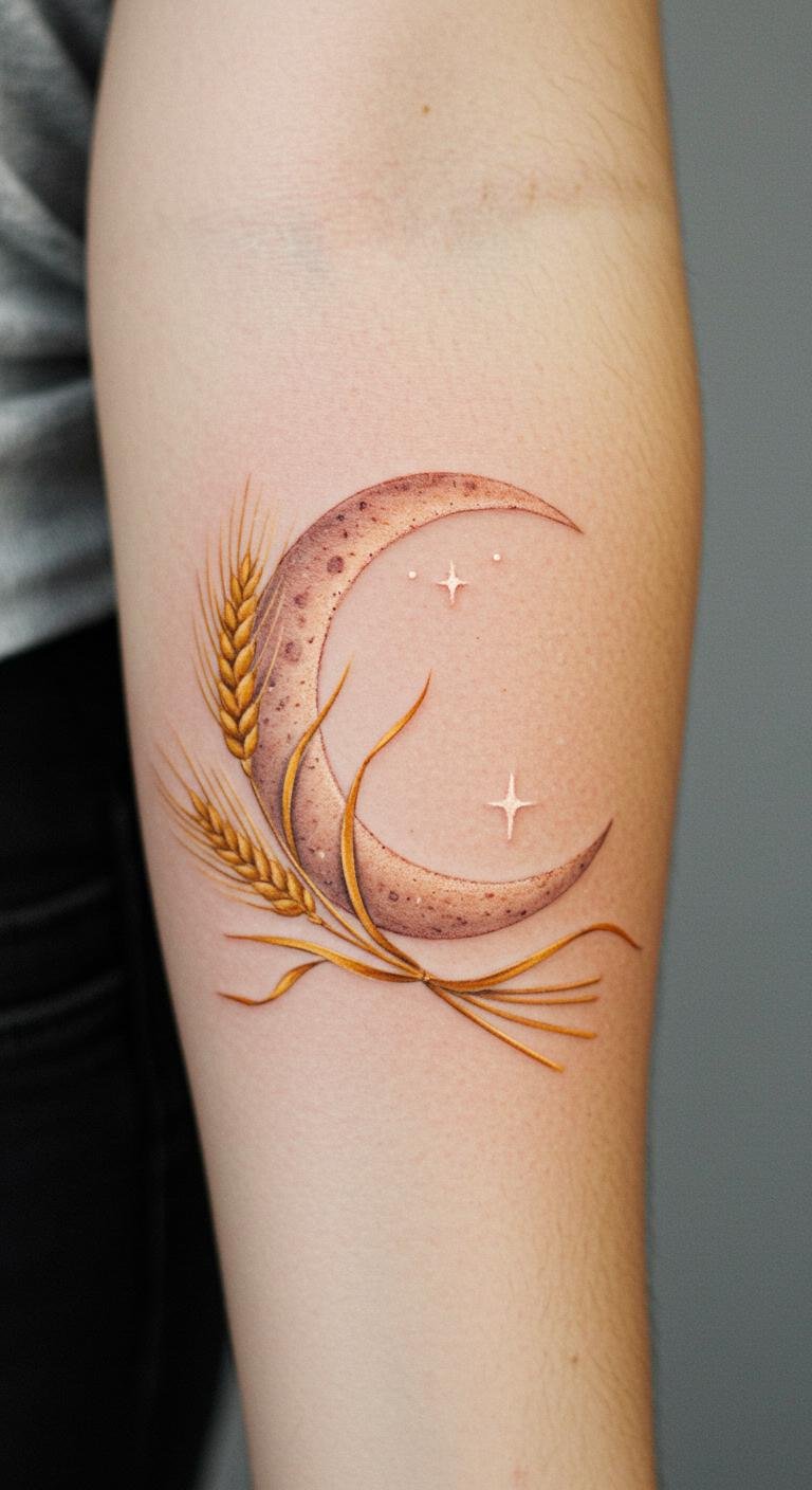 The crescent moon and wheat tattoo resonates with Virgo energy, symbolizing intuition, growth, fertility, and nourishment.