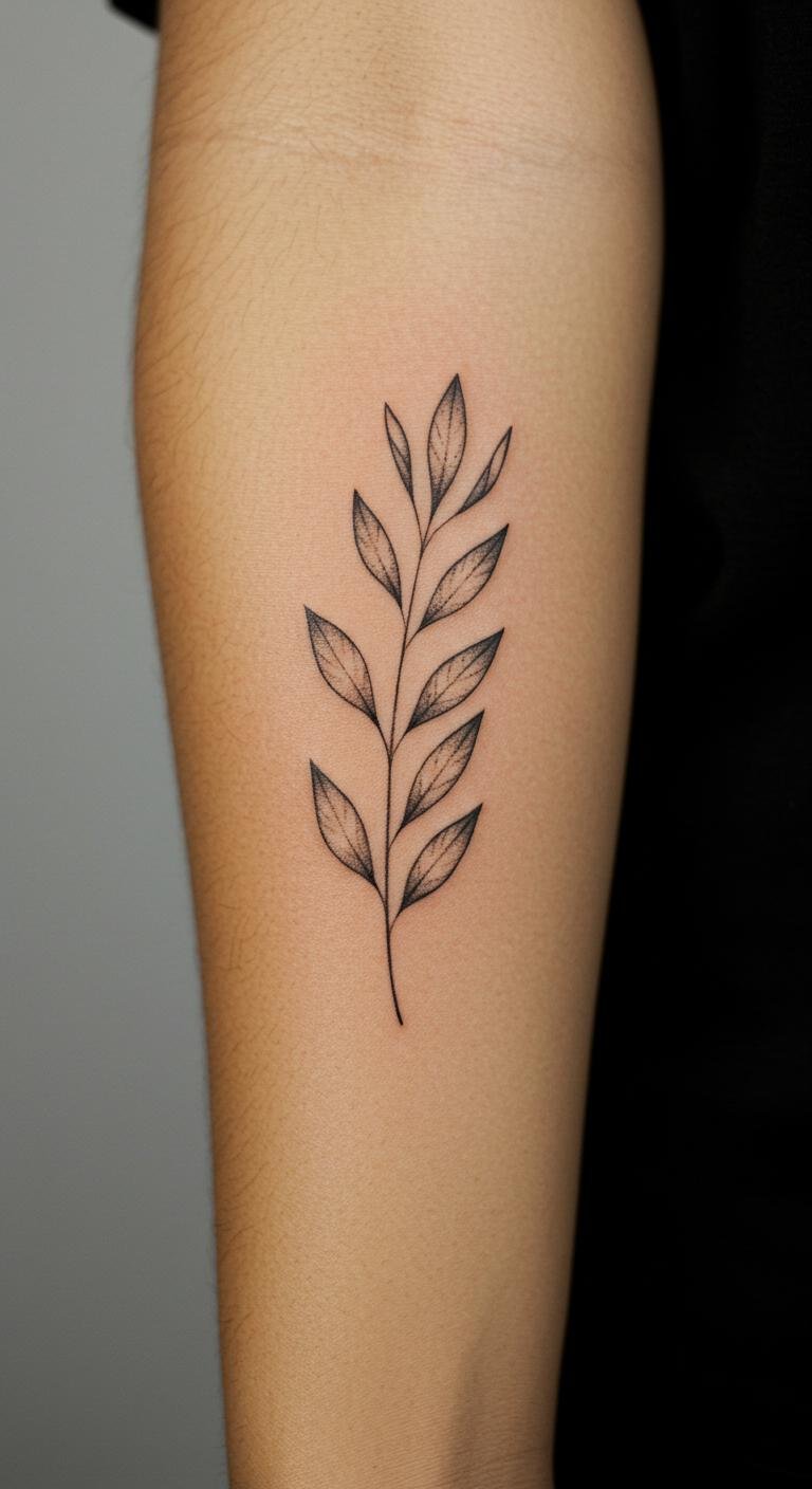 This minimalist botanical leaf tattoo symbolizes the essence of Virgo, embodying practicality and a deep connection to nature.