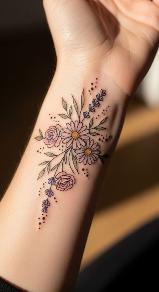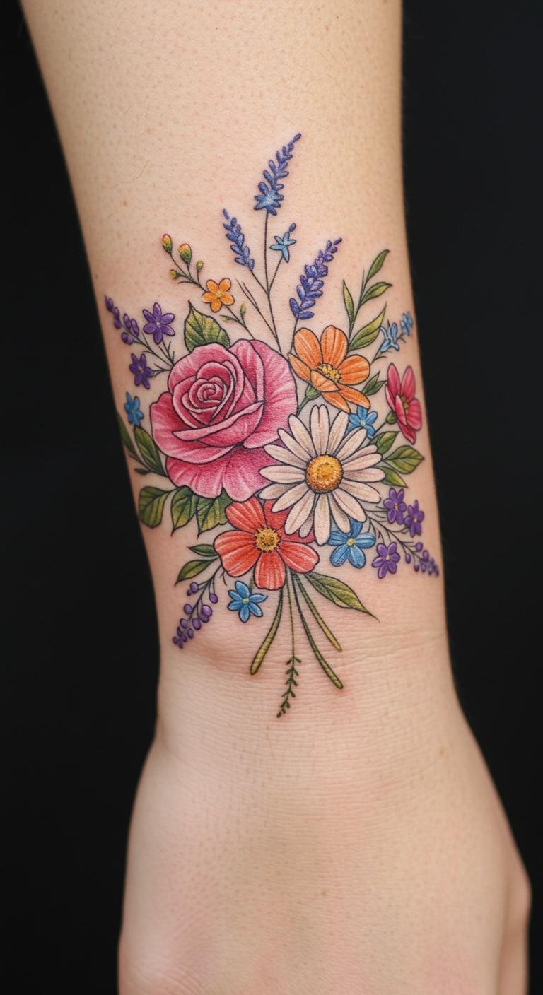 Colorful Floral Bouquet Wrist Tattoo