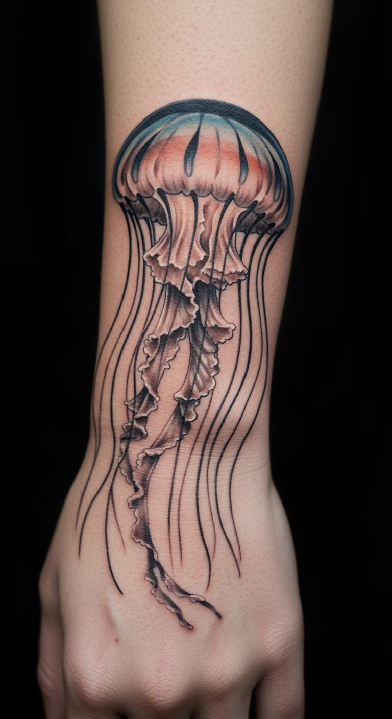 This jellyfish wrist tattoo encapsulates the ethereal beauty of the creature, symbolizing adaptability and freedom.