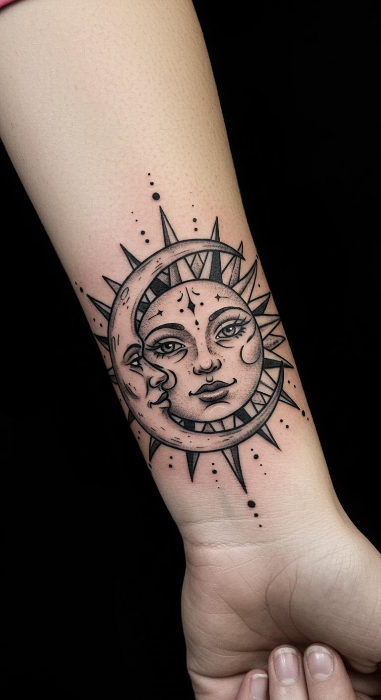 This tattoo symbolizes the eternal balance between day and night, representing harmony and the cyclical nature of life.