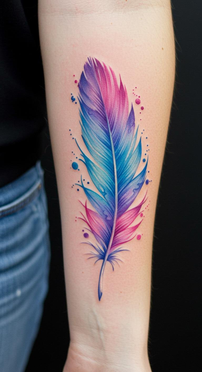 The watercolor feather tattoo embodies a sense of freedom and creativity, symbolizing liberation and inspiration.