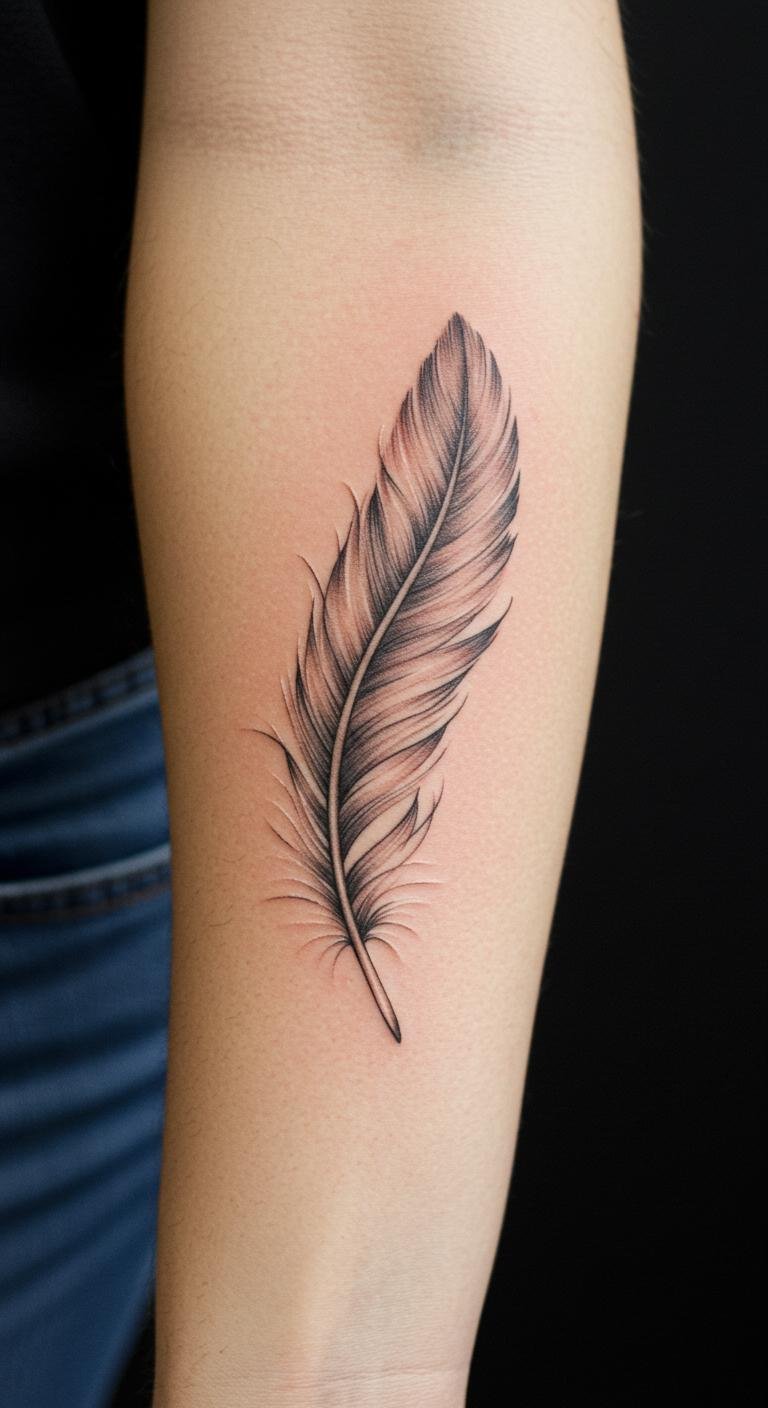 The feather symbolizes lightness, flight, and the journey of life, representing personal growth and the pursuit of dreams.